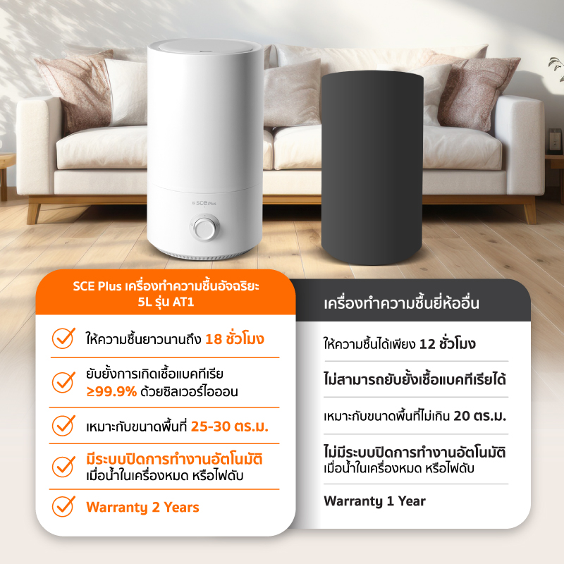 SCE Plus รุ่น AT1 เครื่องเพิ่มความชื้นขนาดเล็กที่เน้นความเรียบง่ายและใช้งานสะดวก เหมาะกับการใช้งานส่วนตัว เช่น บนโต๊ะทำงานหรือหัวเตียง ให้ไอน้ำละเอียดช่วยลดอากาศแห้ง เสียงเงียบ ใช้งานง่ายด้วยปุ่มเดียว ดีไซน์กะทัดรัด น้ำหนักเบา พกพาสะดวก เหมาะกับผู้ที่ต้องการเครื่องเพิ่มความชื้นพื้นฐานในราคาประหยัด