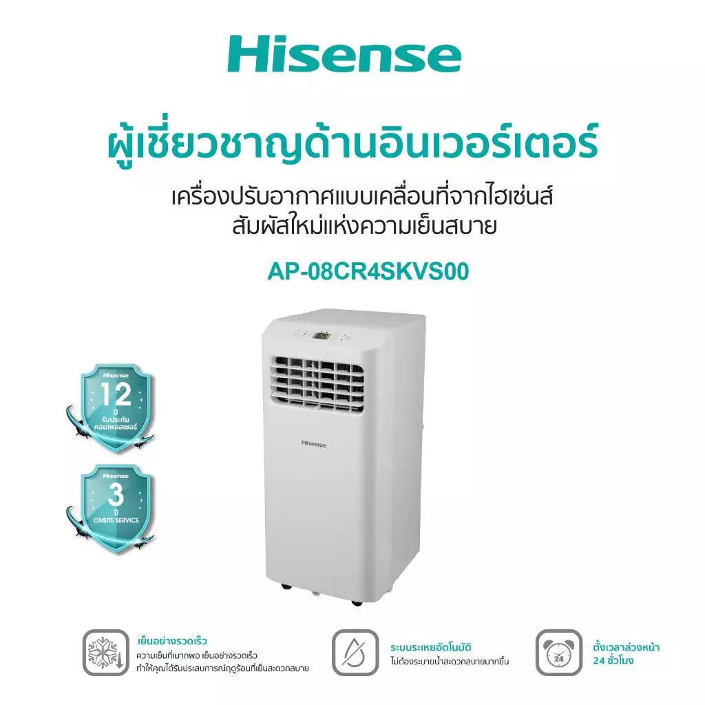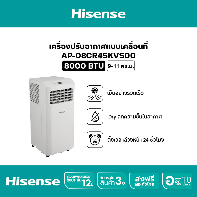 Hisense แอร์เคลื่อนที่ Portable Air Conditioner 12000 BTU รุ่น AP-12CR4RNXS00 เป็นรุ่นเดียวกับข้อ 3 แต่เน้นจุดเด่นเรื่องฟังก์ชันเพิ่มเติม เช่น หน้าจอ LED แสดงผลชัดเจน และโหมดตั้งเวลาปิดเปิดอัตโนมัติ ช่วยประหยัดพลังงานและเพิ่มความสะดวกสบาย กำลัง 12,000 BTU เย็นเร็วเหมาะกับห้องขนาดเล็กถึงกลาง เคลื่อนย้ายง่ายด้วยล้อเลื่อน ดีไซน์กะทัดรัด ใช้งานได้ทั้งห้องนอน ห้องนั่งเล่น หรือห้องทำงาน