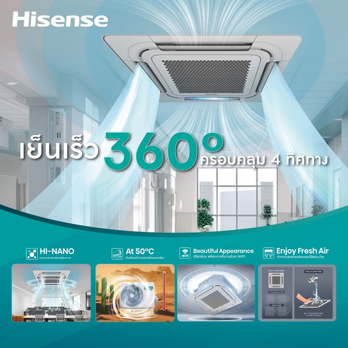 Hisense แอร์สี่ทิศทาง แบบฝังฝ้า Round Flow Inverter (AUC) ขนาด 24000 BTU แอร์เชิงพาณิชย์ที่ออกแบบมาติดตั้งในฝ้าเพดาน ให้ลมเย็นกระจายรอบทิศทาง 360° เหมาะกับห้องประชุม ร้านอาหาร หรือออฟฟิศขนาดใหญ่ กำลัง 24,000 BTU รองรับพื้นที่กว้าง ระบบ Inverter ช่วยประหยัดไฟและทำงานเสถียรต่อเนื่อง มีแผ่นกรองฝุ่นและโหมดลดความชื้น ตัวเครื่องดีไซน์บางสวย เข้ากับเพดานได้อย่างลงตัว