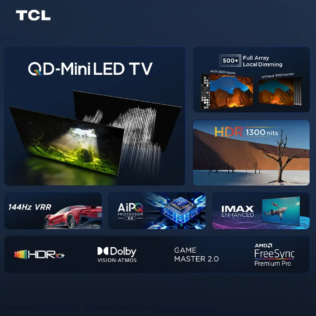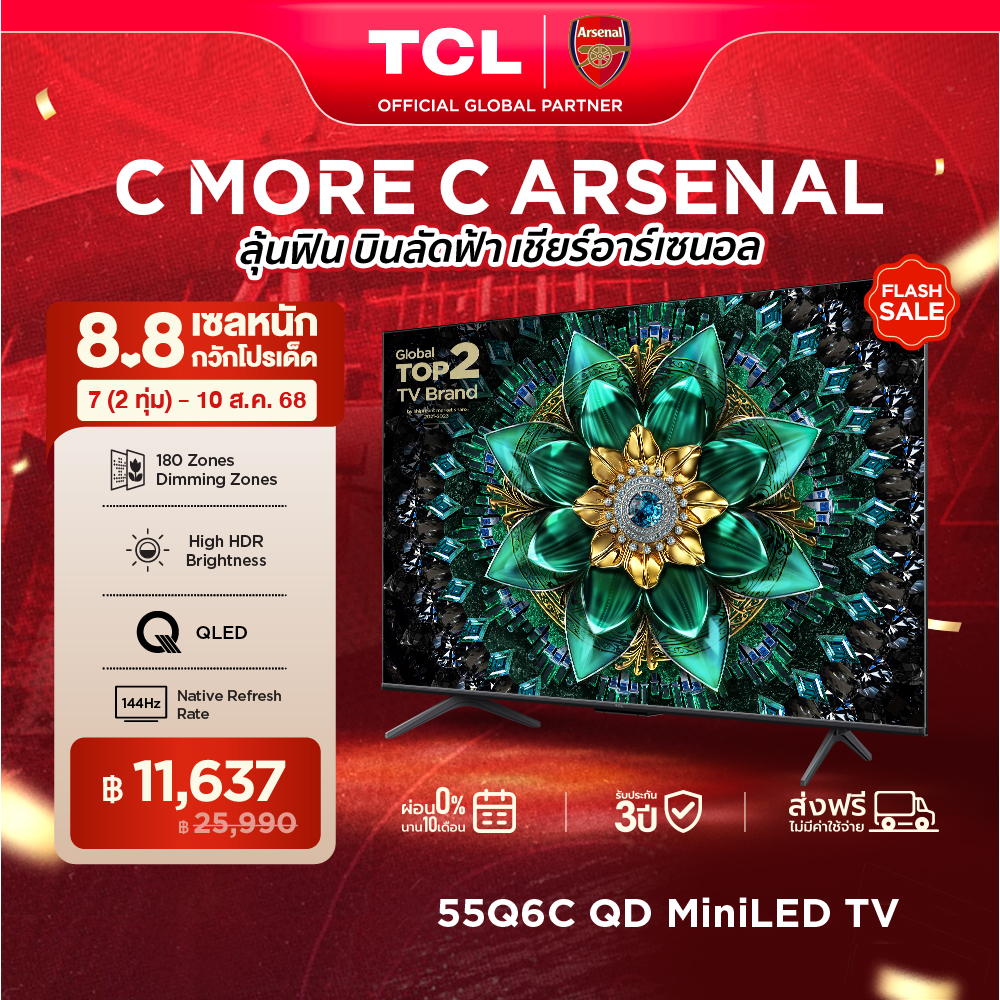 TCL ทีวี 55 นิ้ว 4K Mini QLED Google Gaming TV รุ่น 55Q6C ทีวี Mini QLED ขนาด 55 นิ้ว ความละเอียด 4K HDR สีสันจัดจ้าน คอนทราสต์สูง รองรับ Dolby Vision IQ และ HDR10+ ระบบเสียง Dolby Atmos ให้มิติรอบทิศทาง เหมาะทั้งดูหนัง ซีรีส์ และเล่นเกม รองรับ HDMI 2.1, VRR ทำให้เล่นเกมลื่นไหลไม่มีสะดุด ดีไซน์หรูหรา เหมาะกับผู้ที่ต้องการทีวีพรีเมียมขนาดกลาง