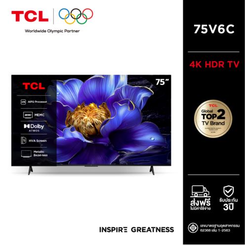 TCL ทีวี 75 นิ้ว 4K UHD Google TV รุ่น 75V6C HVA Panel ทีวีจอใหญ่สุดอลังการ ขนาด 75 นิ้ว ความละเอียด 4K UHD ใช้พาเนล HVA ที่ให้คอนทราสต์ลึกและสีดำสนิท มาพร้อมระบบ Google TV รองรับทุกแอปสตรีมมิ่งยอดนิยม เช่น Netflix, Disney+, Prime Video เสียง Dolby Audio สร้างมิติสมจริง เหมาะสำหรับห้องนั่งเล่นขนาดใหญ่หรือโฮมเธียเตอร์ ดีไซน์ขอบจอบาง ดูหรูหราและลงตัวในบ้านสมัยใหม่