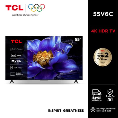 TCL ทีวี 55 นิ้ว V6C 4K UHD Google TV รุ่น 55V6C ทีวี 55 นิ้ว 4K UHD รุ่นยอดนิยม ดีไซน์ขอบบางเรียบหรู ระบบ Google TV ลื่นไหล รองรับ HDR10 และ Dolby Audio เสียงใสคม มีโหมดภาพหลากหลายให้เลือกตามคอนเทนต์ เช่น ดูหนัง กีฬา หรือเกม คุ้มค่าในราคากลาง เหมาะสำหรับห้องนั่งเล่นหรือห้องนอนใหญ่ที่ต้องการทีวีจอใหญ่ใช้งานครบทุกด้าน