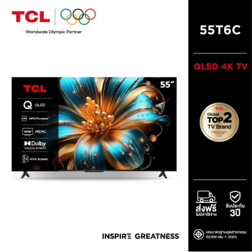 TCL ทีวี 55 นิ้ว 4K QLED Colorful Google TV รุ่น 55T6C รุ่น QLED ที่อัปเกรดความสดของสีและคมชัดขึ้นไปอีก ขนาด 55 นิ้ว ความละเอียด 4K รองรับ Dolby Vision และ Atmos ให้ภาพและเสียงเต็มอรรถรส ระบบ Google TV ใช้งานง่าย โหลดแอปได้ครบ ดีไซน์บาง ขอบจอเล็ก ดูพรีเมียม เหมาะกับผู้ที่อยากได้ทีวี QLED ในราคากลาง พร้อมคุณภาพเกือบเทียบเท่ารุ่นพรีเมียม