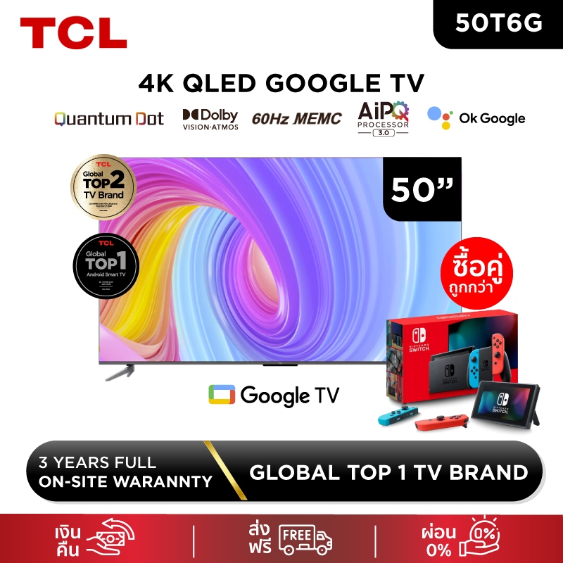 TCL ทีวี 50 นิ้ว 4K QLED Colorful Google Gaming TV รุ่น 50T6C HVA ทีวี QLED จอ 50 นิ้ว พาเนล HVA ให้สีดำสนิทและคอนทราสต์สูง ความละเอียด 4K HDR รองรับ Dolby Vision และ Atmos สำหรับภาพและเสียงที่สมจริง ใช้ระบบ Google TV ที่ทันสมัย มี Game Mode และ HDMI 2.1 สำหรับเล่นเกมลื่นไหล เหมาะกับห้องนั่งเล่นหรือห้องนอนใหญ่ที่ต้องการทั้งดูหนังและเกม