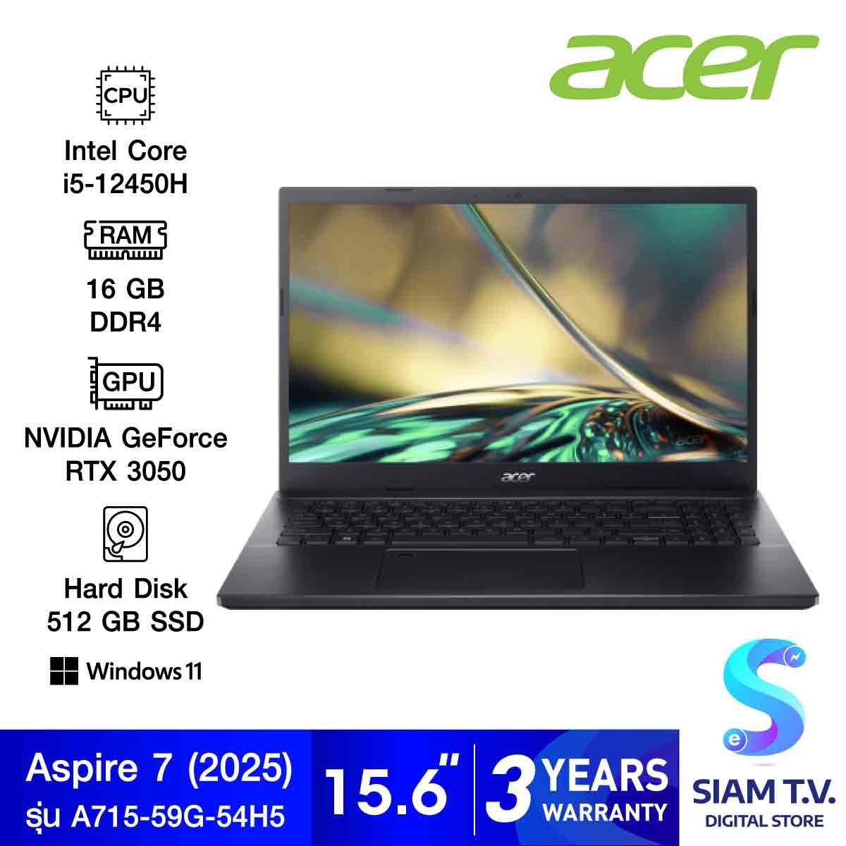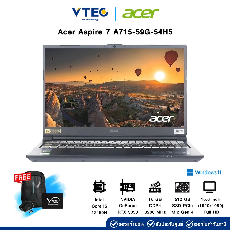 ACER ASPIRE 7 A715-59G-54H5 โน้ตบุ๊กสายทำงาน-มัลติมีเดีย หน้าจอ 15.6 นิ้ว FHD รีเฟรชเรต 144Hz ใช้ซีพียู Intel Core i5-12450H และการ์ดจอ NVIDIA GeForce GTX 1650 เหมาะกับการใช้งานทั่วไป เล่นเกมออนไลน์ หรืองานตัดต่อเล็กน้อย ตัวเครื่องดีไซน์เรียบง่ายไม่ฉูดฉาดเหมือนโน้ตบุ๊กเกมมิ่ง แบตเตอรี่ใช้งานได้กำลังดี เหมาะกับคนที่ต้องการโน้ตบุ๊กใช้งานเอนกประสงค์